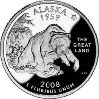 Грізлі з лососем (риба штату) в зубах та Полярна зоря Напис: "The Great Land" |