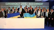 18 грудня у Мюнхені було оголошено, що турнір відбудеться в Україні.[6][7][8][9] Гасло української заявки: «Ми готові!» (англ. "We are ready!"),[10] — що вказує на досвід країни, який був отриманий при приготуванні до чемпіонату Європи з футболу 2012 року. Як запевняє президент федерації баскетболу України, Олександр Волков, саме цей досвід та готовність української інфраструктури до прийняття чемпіонатів такого рівня стали вирішальним фактором в обранні України.[11]