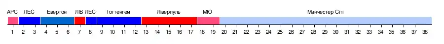 | 1 | Манчестер Сіті | 38 | 27 | 5 | 6 | 83 | 32 | +51 | 86 | Ліга чемпіонів груповий раунд |