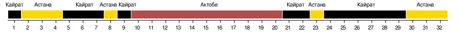 | Команда | АСТ | АКТ | КАЙ | ОРД | КСР | ШАХ | ТОБ | ЖЕТ | АТИ | ІРТ | ТАР | ОКЖ |
