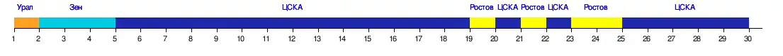 | ЦСКА (Москва) | 6 | 3 | 2 | 2 | 1 | 1 | 1 | 1 | 1 | 1 | 1 | 1 | 1 | 1 | 1 | 1 | 1 | 1 | 1 | 2 | 1 | 2 | 1 | 2 | 2 | 1 | 1 | 1 | 1 | 1 |
