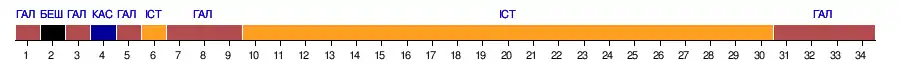 | Команда ╲ Тур | 1 | 2 | 3 | 4 | 5 | 6 | 7 | 8 | 9 | 10 | 11 | 12 | 13 | 14 | 15 | 16 | 17 | 18 | 19 | 20 | 21 | 22 | 23 | 24 | 25 | 26 | 27 | 28 | 29 | 30 | 31 | 32 | 33 | 34 |