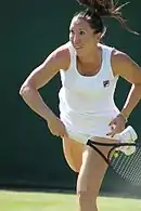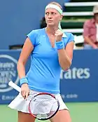 Петра Квітова had a disappointing start of 2013, not winning back to back matches in the first month including a loss у другому колі of the Відкритий чемпіонат Австралії to Лора Робсон.[48] She then won her перший титул за сезон Dubai Tennis Championship defeating Сара Еррані in three sets.[49] She reached her second final of the year BNP Paribas Katowice Open but fell to Italian Роберта Вінчі.[50] Kvitová then suffered a third round loss Відкритий чемпіонат Франції hands of American Джеймі Гемптон.[51] At Вімблдон, she was able to reach the quarterfinals for the 4th year in a row but received an upset in the hands of Belgian Кірстен Фліпкенс.[52] As the defending champion New Haven Open at Yale she reached the final, but ended in the losing side against Сімона Халеп.[53] At the Відкритий чемпіонат США, Kvitová fell convincingly to American wildcard Алісон Ріск в третьому колі in 65 minutes.[54] She then won her 11-й титул у кар'єрі Toray Pan Pacific Open beating German Анджелік Кербер in three sets.[55]