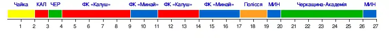 | ФК «Калуш» | 2:0 | 1:0 | 1:0 | 1:1 | 1:0 | 0:0 | 0:1 | 1:0 | 1:0 | 1:4 | 0:0 | 2:3 | 4:3 | 1:2 | |||||||