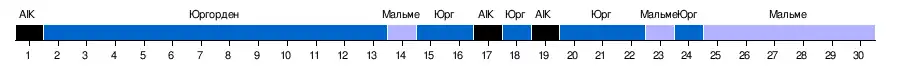| «Юргорден» | 1-4 | 3-2 | –––– | 0-3 | 2-1 | 1-0 | 4-1 | 0-0 | 1-0 | 3-2 | 3-1 | 0-0 | 3-0 | 2-0 | 5-1 | 2-3 |