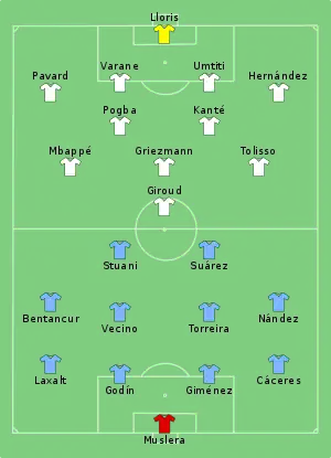 26. Match report – Quarter-final – Uruguay v France (PDF). FIFA.com. Fédération Internationale de Football Association. 6 липня 2018. Процитовано 6 липня 2018.