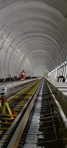 Протягом 2017 року розпочато встановлення колій, кабелів, систем телекомунікацій і радіо, систем автоматизації, контактних мереж та різноманітних систем безпеки і контролю.[4] Протягом серпня 2017 року закладено перші дистанції безбаластних колій у північному кінці східного тунелю.[18] 30 травня 2018 року укладені останні шпали, уможливлюючи залізничний рух усією довжиною тунелю.[19]