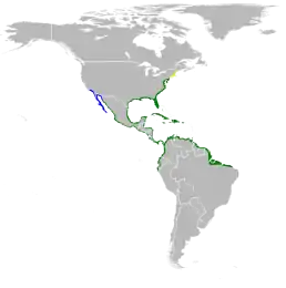 ![]() Поширення Egretta tricolor Жовтий — Гніздовий ареал, Зелений — Тільки взимку Синій — Цілорічно | ||||||||||||||||||