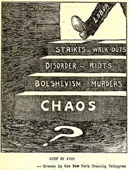 6-11 лютого 1919 року триватиме загальна страйк в Сіетлі, в тому числі за участю профспілок Індустріальні робітники світу і Американська федерація праці . Мер Сіетла Хансон порівняв страйк з «революцією в Петрограді», 39 профспілкових діячів ІРМ були арештовані, як «анархісти». Газета «Чикаго Трибюн» назвала страйк «марксистським» «кроком з Петрограда в Сіеттл».