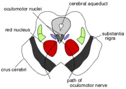 ![]() Поперечний розріз через середній мозок, який показує місцезнаходження червоних ядер. Верхні горбки чотиригорбкового тіла вгорі малюнку і ніжки мозку знизу малюнку, обидві в розрізі. | |