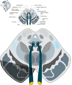 - В людському мозку більша частина вихідної інформації йде пучком волокон через медіальну тегментальну (покришкову) ділянку в напрямку нижніх олив по однойменній стороні і формує частину шляху, що в кінцевому рахунку впливає на мозочок.
