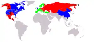 Синій: Сполучені Штати Америки і їх союзники: Канада, Велика Британія та Китайська Народна Республіка.