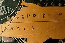 Завдяки підписам на вазах відомі імена близько сорока аттичних вазописців. Крім імені художника на посудині зазвичай написано дав.-гр. ἐγραψεν (égrapsen) — «намалював». До підпису гончаря зазвичай додавалося дав.-гр. ἐποίησεν (epoíesen) — «зробив». Підписи гончарів зустрічаються майже вдвічі частіше, ніж підписи вазописців.[7] Перші підписи датуються 580 роком до н. е.[8] Підписи на кераміці з гордістю часто проставляли вазописці-піонери.[9]