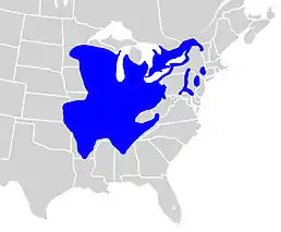 Мешкає у Канаді: Квебек, Онтаріо, штатах США: Луїзіана, Міссісіпі, Нью-Джерсі, Північна Кароліна, Вермонт, Нью-Йорк, Пенсільванія, Огайо, Західна Вірджинія, Вірджинія, Теннессі, Джорджія, Алабама, Кентуккі, Індіана, Іллінойс, Мічиган, Міннесота, Айова, Міссурі, Канзас, Оклахома, Арканзас, Вісконсин, Меріленд, Делавер.