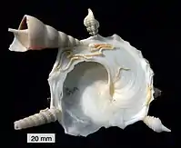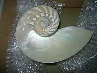 - Головоногі. Найдавніші представники мали пряму довгу конічну черепашку, розділену на камери, через які проходив сифон (у роду Cameroceras така черепашка досягала 10 м у довжину). У багатьох з їх нащадків (наприклад, у амонітів) мушля стала закрученою; серед сучасних тварин таку зберіг наутилус. Але у більшості сучасних головоногих черепашка сильно, або й зовсім, редукована. Восьминоги не мають черепашки взагалі, крім роду Argonauta, самки якого будують однокамерну спіральну мушлю, що не гомологічна мушлям інших головоногих. У кальмарів і пекельного вампіра є гладіус — тонка підшкірна пластинка, що складається в основному з хітину. Каракатиці мають схований всередині тіла залишок черепашки, відомий як кістка каракатиці або сепіон[7], — сильно пориста арагонітова пластинка, що містить газ і потрібна для регуляції пловучості. Черепашка тварин роду Spirula теж цілком схована всередині тіла і виконує ту саму функцію, але не так сильно редукована: вона багатокамерна, має сифон і закручена.