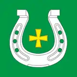 Прапор: у квадратному зеленому полотнищі — срібна підкова, всередині якої золотий хрест.[1]