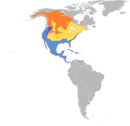 ![]() Мапа поширення виду Гніздування Шляхи міграції Осіле проживання Зимування | ||||||||||||||||