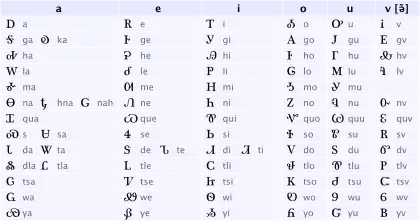 Починаючи з 1819 року для мови черокі використовується особливе складове письмо, винайдене Секвоєю. Воно складається з 85 складових знаків. Деякі з них нагадують латинські букви, але мають зовсім інше значення.