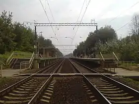 Всього дві берегові платформи, перехід між якими здійснюється по пішохідному настилу через залізничні колії головного ходу. Турнікетами не обладнані. Квиткова каса знаходиться із західного боку колій біля пішохідного настилу на північ від платформ. Раніше також працювала квиткова каса в павільйоні на східній платформі («в центр»).