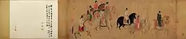 На другому сувої настільки ж артистично зображена кавалькада з шести дам у супроводі двох чоловіків, одна з жінок показана на коні разом з маленькою донькою. Подробиці зовнішнього вигляду персонажів настільки ретельно опрацьовані, що помітні навіть деталі дамських зачісок та головних прикрас. Вершник, який очолює кавалькаду, одягнений в одяг темного кольору, що відразу ж виділяє його на тлі інших дійових осіб. Нарядні сукні дам виконані в елегантних рожево—сірих тонах. Фігури коней не тільки пластичні, але й відзначені динамікою, при цьому від уваги живописця не вислизнули нюанси їх зовнішнього вигляду — тип масті, малюнок ретельно укладених грив і хвостів, орнаменти кінської збруї. Робота пензля та колірне рішення картини надають їй настрій святкової урочистості і присмак вишуканої рафінованості, що доносить до нас атмосферу придворного життя танської епохи.