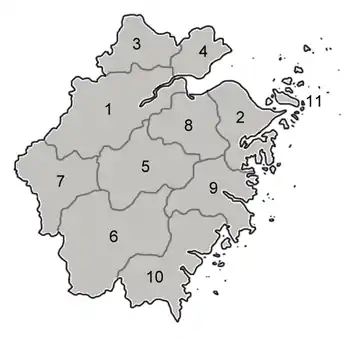 Провінція Чжецзян поділяється на два міста субпровінційного значення і дев'ять міських округів: