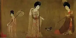 ![]() Придворні панні з квітами у засічками. Чжоу Фан. Деталь сувою. | |