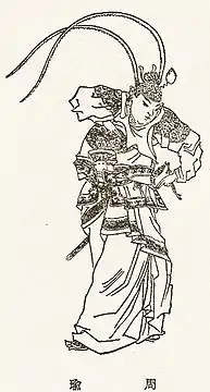 Чжоу Юй (175—210) відомий воєначальник Періоду Саньго. Один з найбільш здібних полководців Сунь Це і його наступника Сунь Цюаня. Керував військами царства У в битві при Чібі. У військовому майстерності та кмітливості змагався з Чжуге Ляном. Чжоу Юй був одружений з Сяо Цяо, яка, згідно з «Романом трьох держав», разом зі своєю сестрою Да-цяо була однією з найбільших красунь тієї епохи. Після битви при Чібі відносини між державами У і Шу псуються. Чжоу Юй розпочинає серію інтриг проти Лю Бея і, після їх невдачі, виступає проти держави Шу у військовий похід, де й умирає.