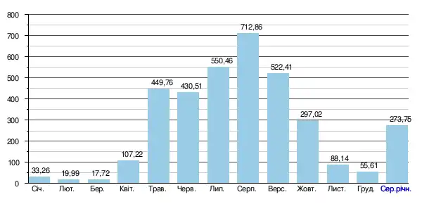 За період спостереження встановлено, мінімальний середньомісячний стік становив 17,7 м³/с (у березні), що становить менше 2,5% від максимального середньомісячного стоку, який відбувається у серпні місяці та становить — 713 м³/с і вказує на доволі високу амплітуду сезонних коливань.