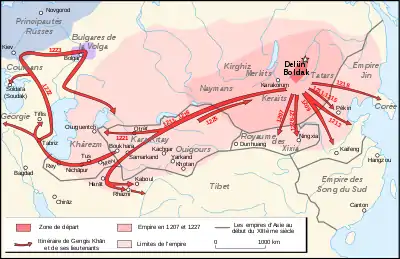 Після взяття Самарканду (весна 1220 року) Чингісхан відправив війська для захоплення хорезмшаха Мухаммеда II, який втік за Амудар'ю. Тумен и Джебе та Субедей пройшли через Північний Іран і вторглися на Південний Кавказ, приводячи міста до покірності переговорами або силою і збираючи данину. Через Дербентський прохід вони проникли на Північний Кавказ, розгромили аланів, а потім половців. Навесні 1223 року монголи розбили об'єднане русько-половецьке військо на Калці, але при поверненні на схід зазнали нищівної поразки у Волзькій Булгарії. Залишки монгольських військ у 1224 повернулися до Чингісхана, який знаходився в Середній Азії.