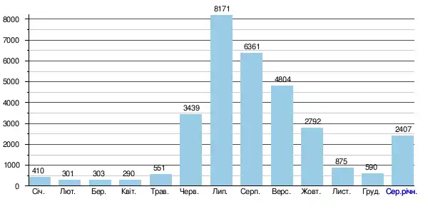 За період спостереження встановлено, що мінімальний середньомісячний стік становив 290 м³/с (у квітні), що відповідає 3,5 % максимального середньомісячного стоку, який відбувається у липні місяці та становить майже — 8171 м³/с і вказує на дуже велику амплітуду сезонних коливань. За період спостереження, абсолютний мінімальний місячний стік (абсолютний мінімум) становив всього 17,0 м³/с (у лютому), а абсолютний максимальний місячний стік (абсолютний максимум) — 11804 м³/с (у липні)[4].