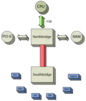 - MCH — контролер-концентратор пам'яті — Північний міст (Northbridge) — забезпечує взаємодію ЦП з пам'яттю і відеоадаптером. У нових чипсетах часто є інтегрована відеопідсистема.