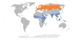 ![]() Ареал поширення виду Гніздування Зимування | ||||||||||||||||