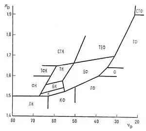К — легкі крони; ФК — фосфатні крони; ТФК — важкі фосфатні крони; К — крони; БК — баритові крони; ТК — важкі крони; КФ — кронфлінти: БФ — баритові флінти; ТБФ — важкі баритові флінти; ЛФ — легкі флінти; Ф — флінти; ТФ — важкі флінти; СТФ — надважкі флінти; СТК — надважкі крони.