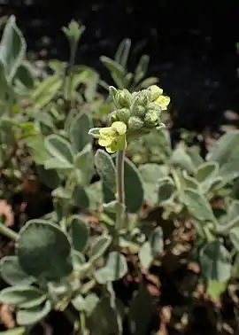 Багаторічна трав'яниста рослина 20–65 см завдовжки. Стебла численні, припідняті. Стеблові листки до 3–4.5 см завдовжки, найбільш широкі у верхній третині й зазубрені тільки вище середини або цілокраї. Зубці чашечки не довше половини трубки. Віночок жовтуватий, з пурпуровими цятками на нижній губі, зовні волосиста, 11–14 мм завдовжки[2].