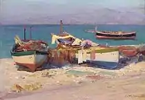 | Повернення додому. Ч. Гемі. 1880-ті | Рибальські човни. Л. Волден. 1920-ті | На річці Хорол. О. Сластіон. 1907 |