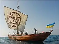 Зображення стародавніх вітрильних човнів були знайдені серед петрогліфів Кам'яної Могили. Переважна більшість зображених суден має одну щоглу й одне пряме вітрило (зображення з печери Кози, печери Риби та ін.). Ці знахідки відносять до ямної культури, яка існувала протягом останньої чверті IV і до початку II тисячоліття до н. е.[10]