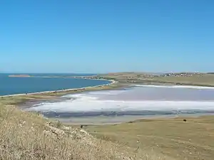![]() Вид на пересип між озером (праворуч) і Азовським морем | ||||