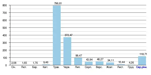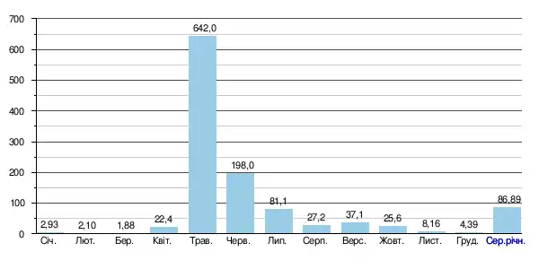 За період спостереження, абсолютний мінімальний місячний стік (абсолютний мінімум) становив 0,50 м³/с (у лютому 1986 року), абсолютний максимальний місячний стік (абсолютний максимум) становив 908 м³/с (у травні 1978 року).