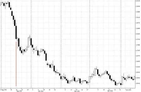 Уважне зіставлення графіка котувань фунта стерлінгів щодо німецької марки з графіком котирувань фунта стерлінгів щодо долара США показує, знецінення фунта насправді почалося за тиждень до угод Сороса — з 9 вересня фунт почав стрімко дешевшати відносно долара. Падіння фунта стерлінгів щодо долара США 16 вересня 1992 року було значно сильнішим (майже у 2 рази в процентному вимірі, див. графіки котирувань), хоча легендарна операція Сороса не належала до ринку фунт/долар до девальвації[2][4].