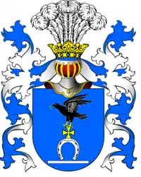 У блакитному полі золотий лицарський хрест на срібній підкові; на хресті готовий до польоту чорний ворон, з золотим кільцем у дзьобі, під підковою срібна балка. У клейноді п'ять страусиних пір'їн. Опис герба міститься в першій частині гербовника Царства Польського, стор 208[1].