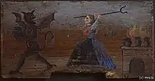 ![]() Жінка проганяє чорта. Польський малюнок, 1870 р. |