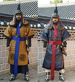 Військо династії Чосон було побудовано за зразком корьоських військ. Основні збройні сили поділялися на П'ять гвардій, розміщених у провінціях: Передня гвардія квартирувалася в Чолла, Задня гвардія — в Хамгьон, Ліва гвардія — в Кьонсан, Права гвардія — в Пхьонан, а Середня гвардія — в центральних провінціях Хванхе, Кьонгі, Канвон і Чхунчхон. Кожна з гвардій мала свої власні сухопутні армії та флоти. Вони поділялися на «ліві» та «праві», а їх кількість визначалася стратегічною доцільністю. В Сеулі постійно розташувалася Ванська гвардія для захисту столиці.[2].