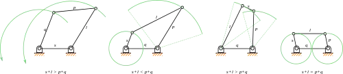 Найкоротша з ланок у чотириланковому механізмі може бути кривошипом у випадку, коли сума довжин найдовшої і найкоротшої ланок не перевищує суму довжин двох інших ланок.