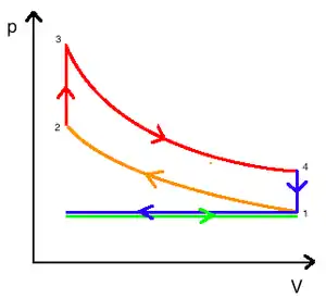 - 3—4 адіабатичне розширення робочого тіла;