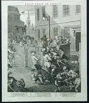 Подібно до інших гравюр Хогарта (наприклад, «Пивної вулиці»), «Чотири стадії жорстокості» були випущені з виховною метою. У цій серії гравюр демонструється легкість, з якою жорстока дитина перетворюється на закоренілого злочинця. Хогарт прагнув привернути увагу до варварського поводження з тваринами, «сам вигляд яких на вулицях нашої столиці тривожить кожен чутливий розум» (англ. that barbarous treatment of animals, the very sight of which renders the streets of our metropolis so distressing to every feeling mind[4]). Хогарт любив тварин, на автопортреті 1745 року він зображував себе зі своїм мопсом[5], біля будинку художника в Чизіку були влаштовані могили його вихованців — собак і птахів[6].