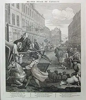 На другій гравюрі — сцена біля Таві Інн Гейт (цю назву іноді з іронією пишуть як Thieves Inn Gate, «ворота злодійського кубла»), одного з готелів канцелярії, де зупинялися члени асоціації юристів Лондона[17]. Том Нерон виріс і став найманим кучером. Його кінь, змучений роками важкої роботи і жорстоким поводженням, впав, зламав ногу і розбив віз. Том побив коня так сильно, що вибив йому око. Хогарт зображує чотирьох огрядних адвокатів, що намагаються вибратись з воза. Ймовірно, це карикатури на відомих у той час юристів, проте ідентифікувати їх неможливо. Тут же можна побачити, як пастух до смерті забиває ягня, переобтяженого осла б'ють по крупу, а розлючений бик підкидає одного зі своїх мучителів.