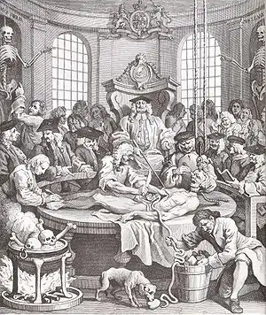 Композиція сцени — пастиш за мотивами ілюстрації з фронтисписа підручника Андреаса Везалія «Про будову людського тіла» і, можливо, Quack Physicians' Hall (близько 1730 року) голландського художника Эгберта ван Хеемскерка, що жив у Англії. Роботами останнього захоплювався Хогарт[26]. Можливо, джерелом натхнення могла бути гравюра 1495 року Fasciculus Medicinae Йоханнеса де Кетхама, яка простіша за композицією, але має схожість з гравюрою Хогарта[23].