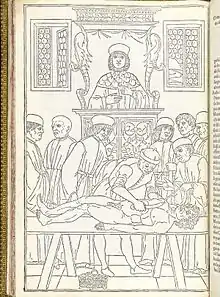 d. ^ Джон Айрленд пізнає голову як «Містер Фрік, майстер Норс, у якого був учнем містер Поттс». Оскільки Айрленд ідентифікує його як майстра Норса, це безперечно означає Джон Фреке, знайомого Хогарта і хірурга у лікарні Святого Варфоломея в 1729–1755 роках і губернатора в період 1736–1756 років. Розтин міг відбуватися в лікарні Святого Варфоломея, в якій працювали усі три хірурги, але місце також має риси Кутлеріанського театру Королівського коледжу лікарів біля Ньюгейта (зокрема, трон) і ніші залу Перукарів і цирульників (яка не використовувалася для розтинів після того, як хірурги відокремилися, заснувавши Компанію хірургів 1745 року).
