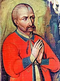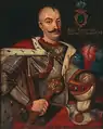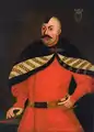 | …середнього зросту, не надто високого й не дуже низького, бровастий, з ясно-синіми очима, кирпатий, безбородий, з густим волоссям над верхньою губою. Голова була зовсім гола, але з одного боку її звисало пасмо волосся — ознака знатного роду… |