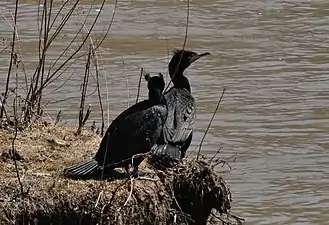 Двоє вухатих бакланів на річці Гамбер у Торонто, Канада